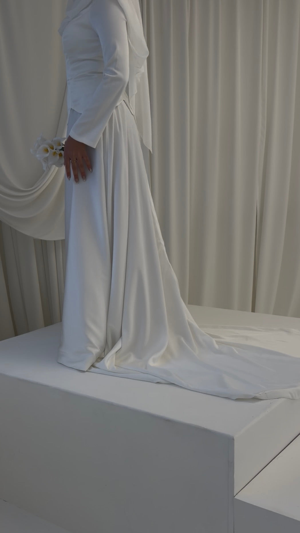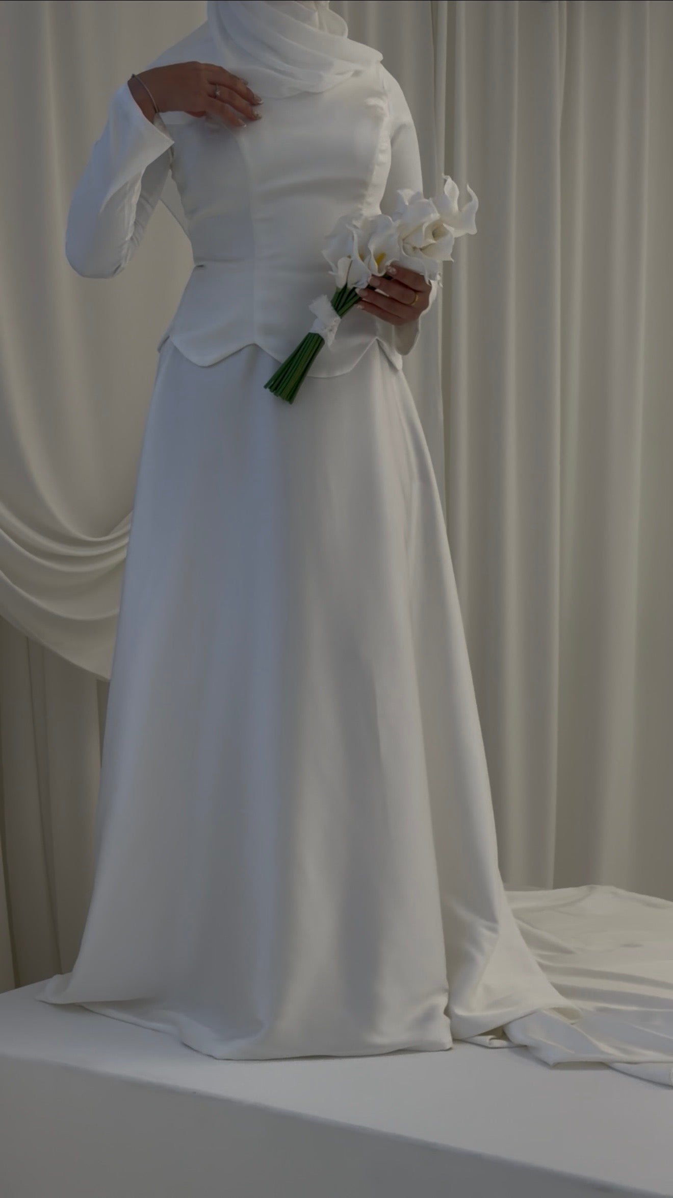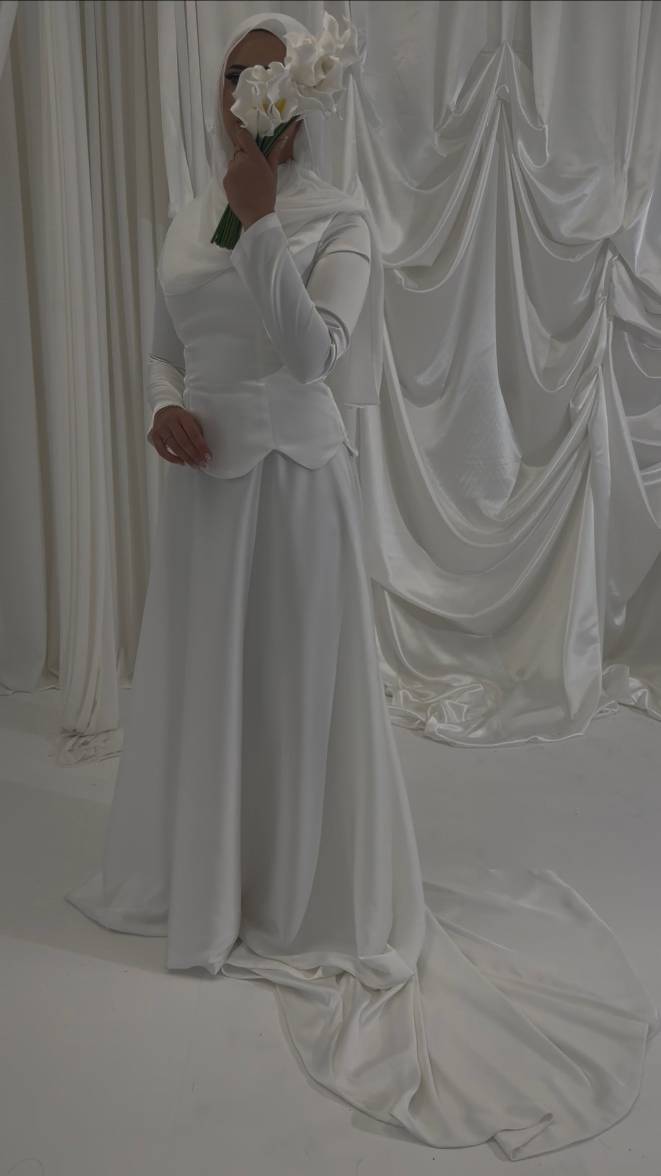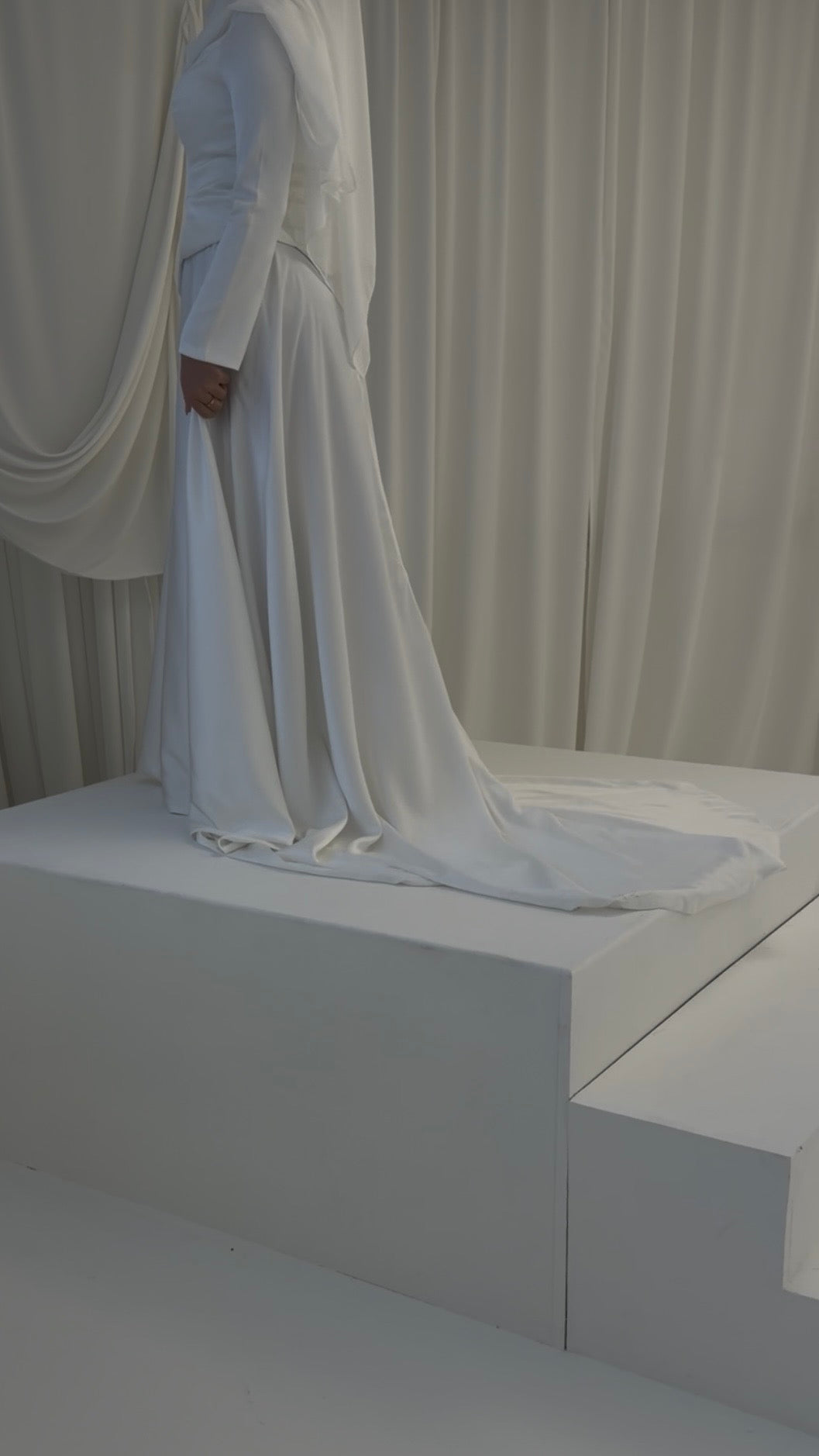 A soft, sculptural gown inspired by the gentle curves of a tulip. The petal-shaped bodice adds subtle structure, while the flowing white skirt and delicate train create effortless grace. Finished with a draped veil-like scarf, this dress embodies purity, elegance, and timeless modesty.