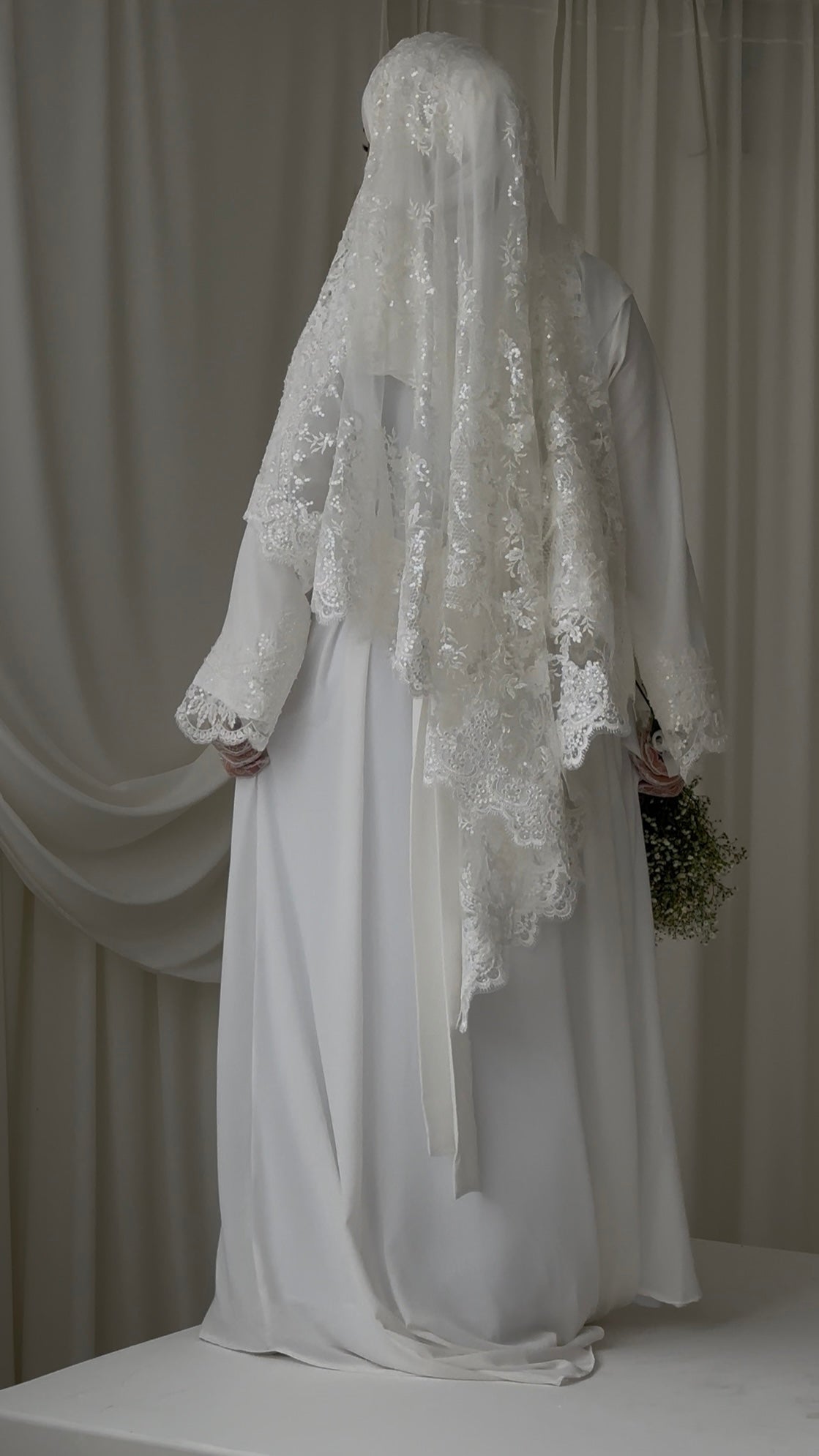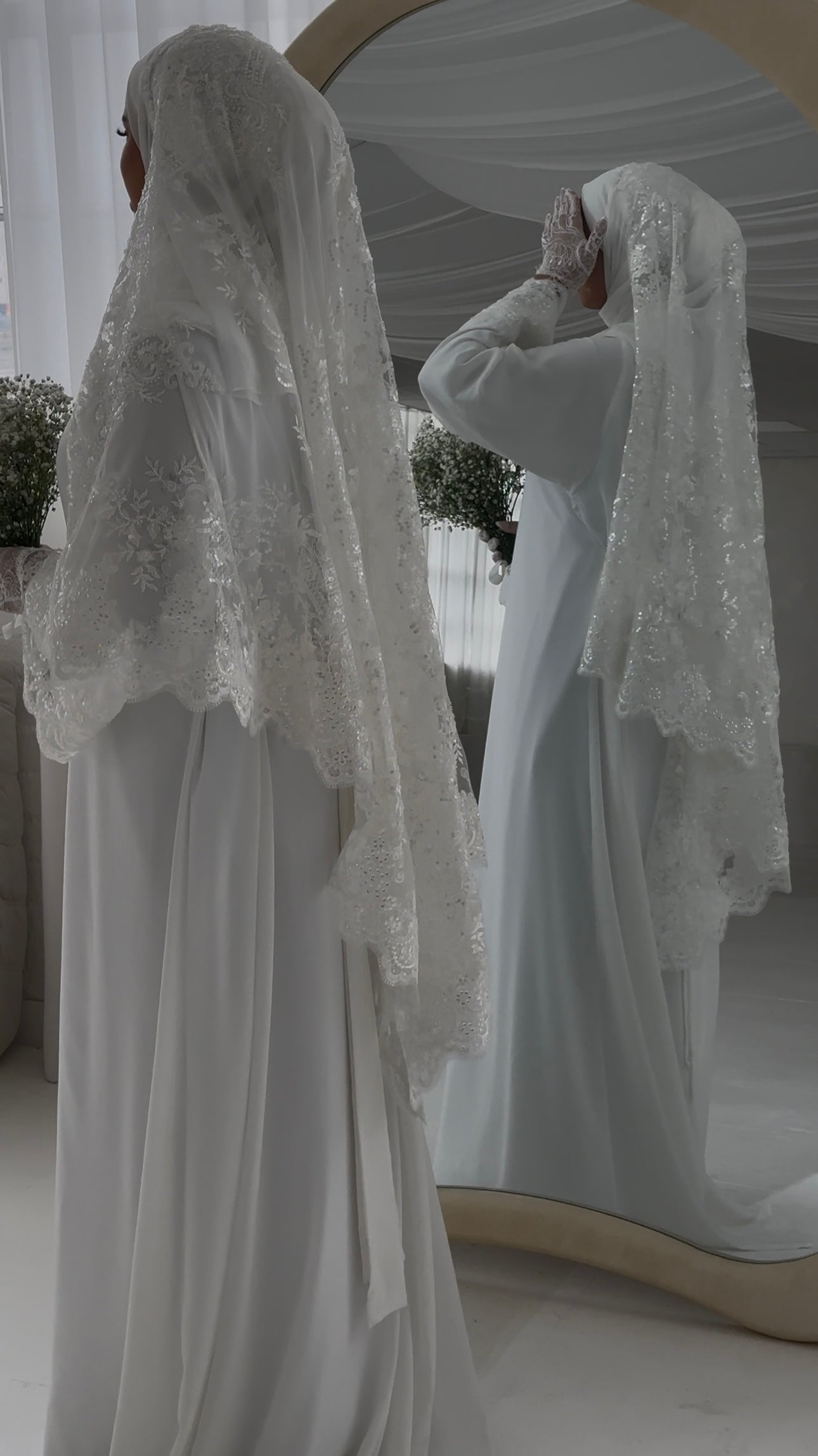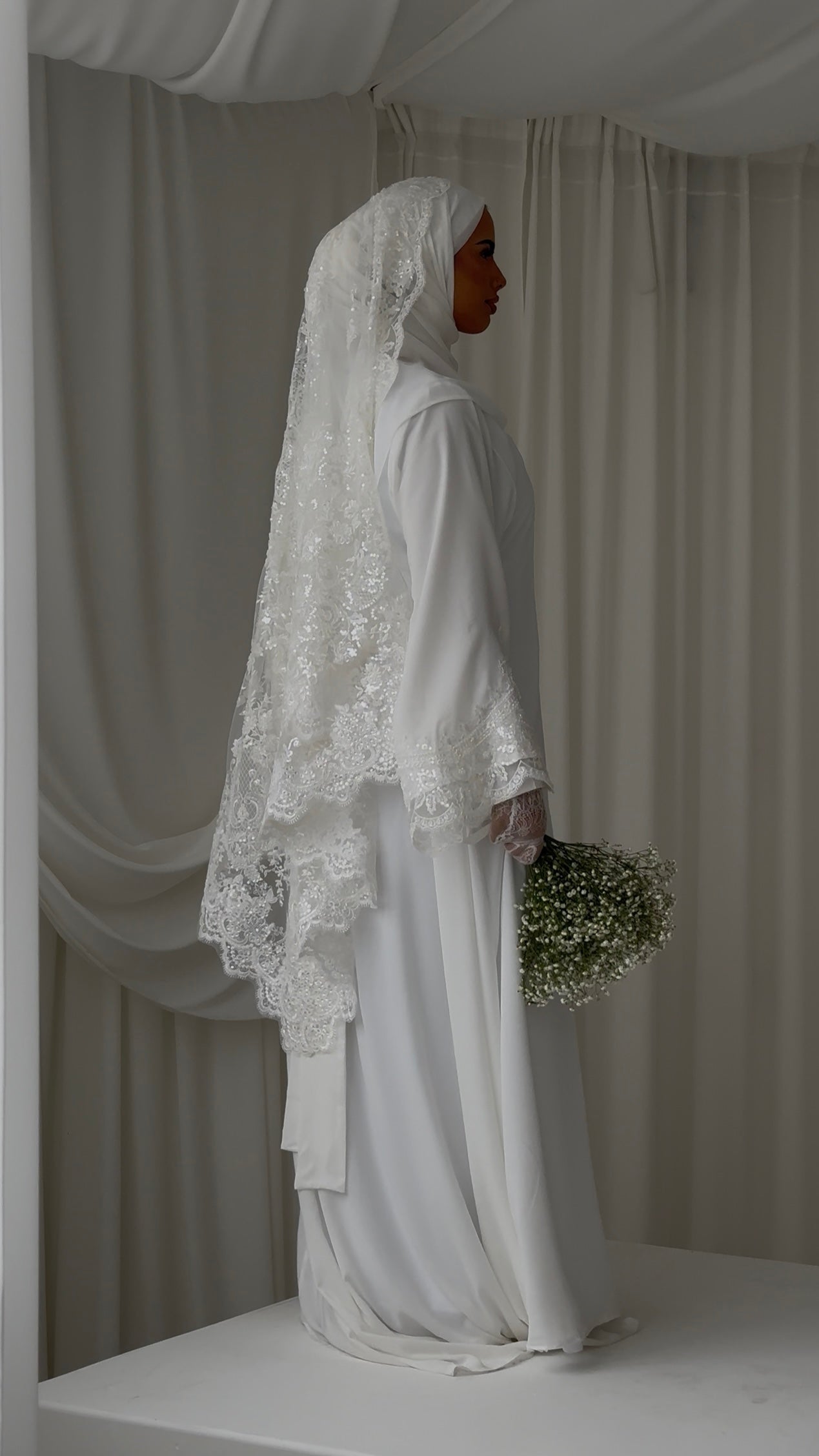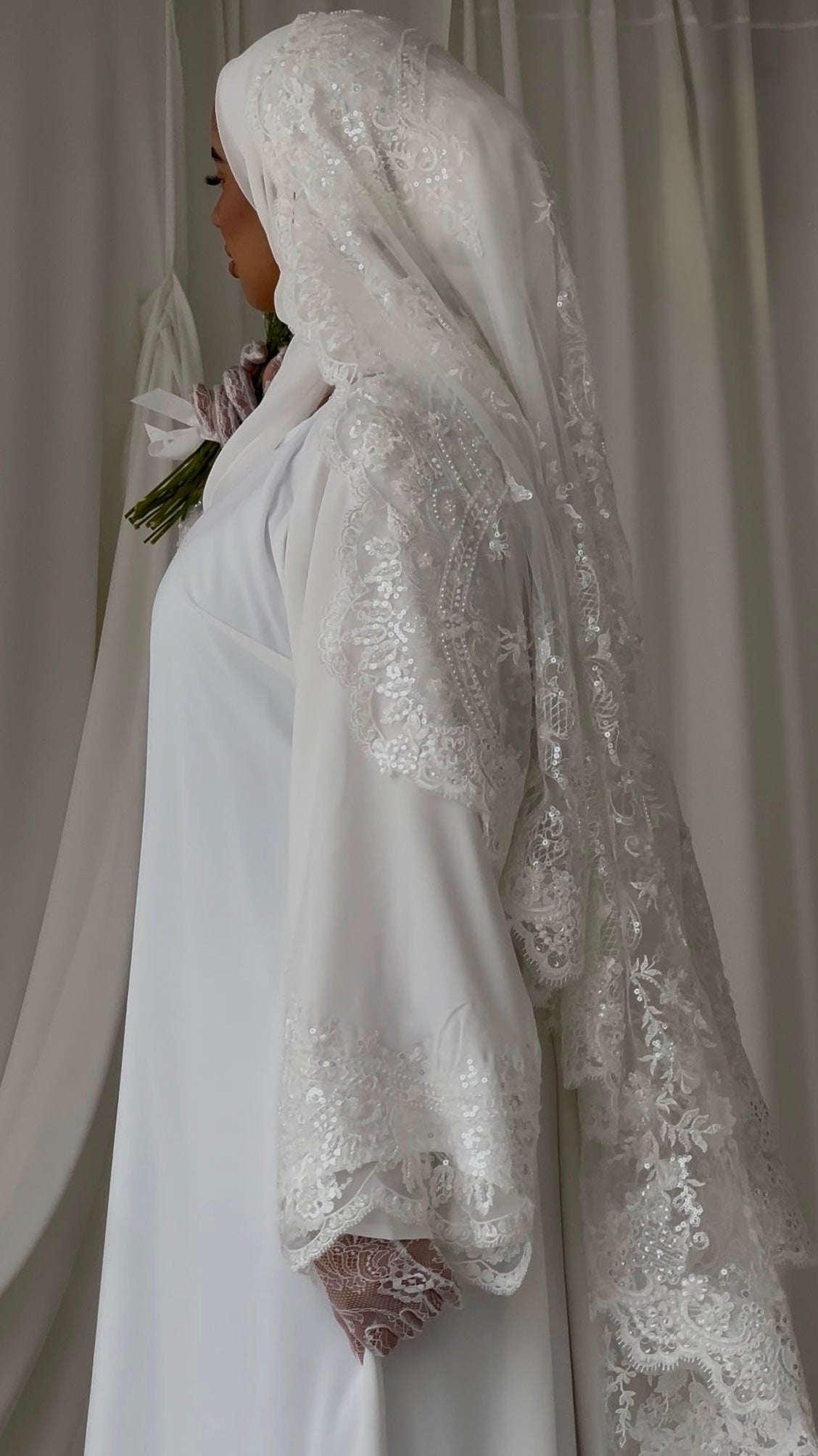 This stunning abaya set is perfect for a special occasion. The abaya has a heavily beaded lace trim on the sleeves . The abaya also features a heavily embellished veil. Abaya is fully lined and includes a hijab and lace veil