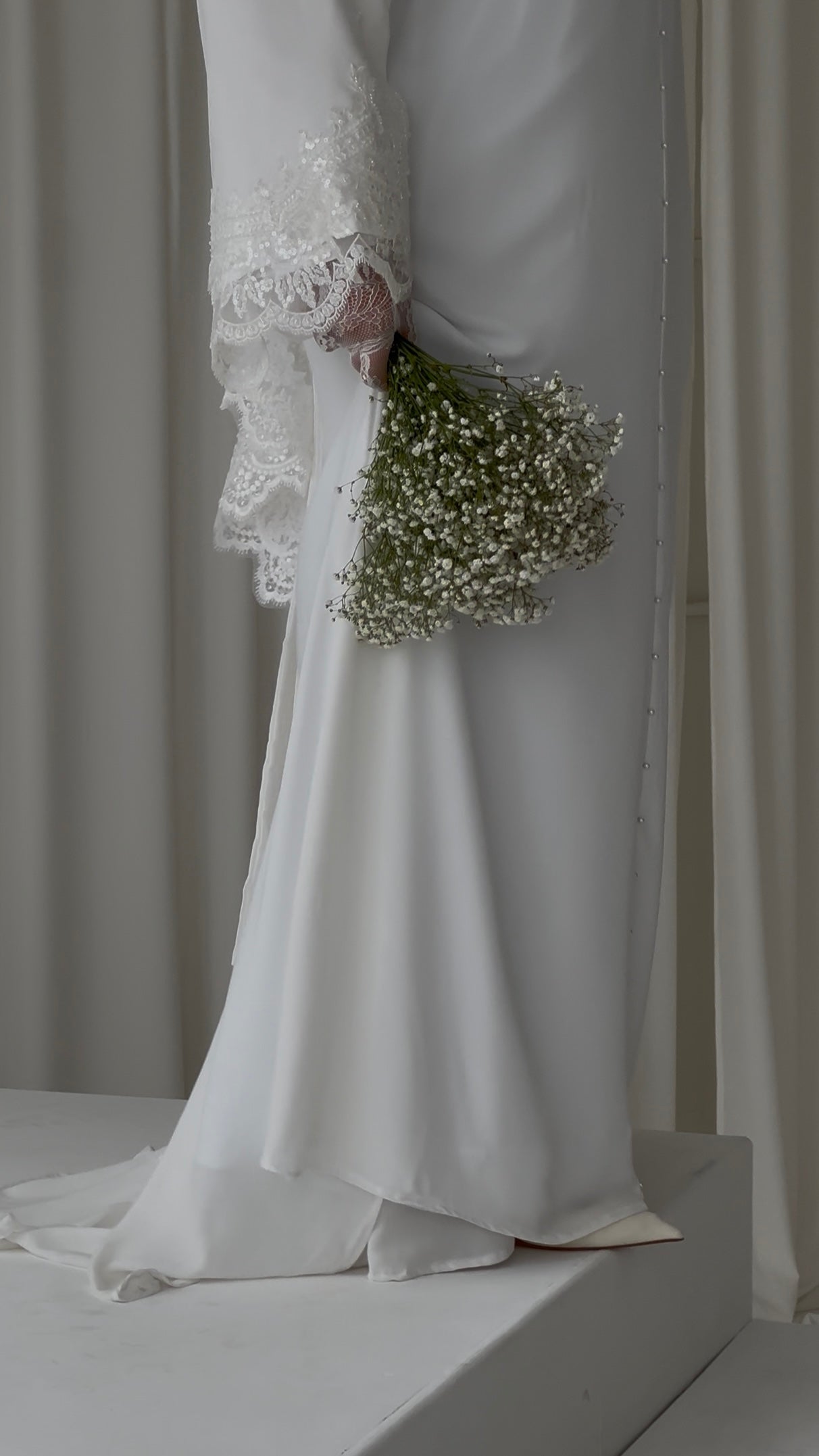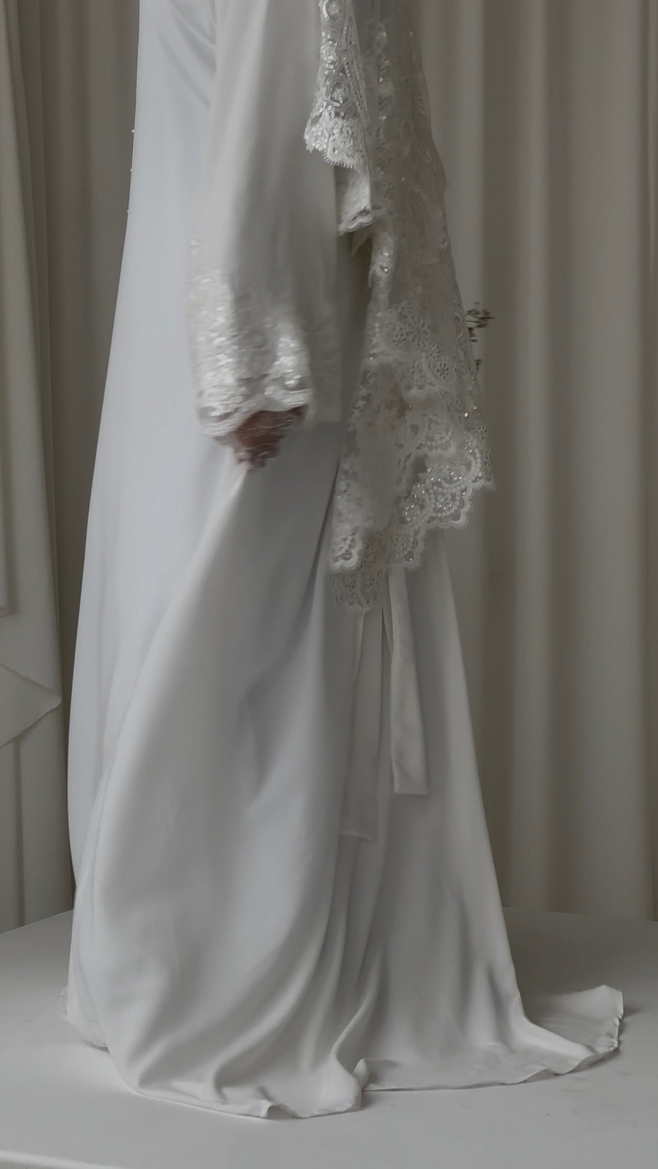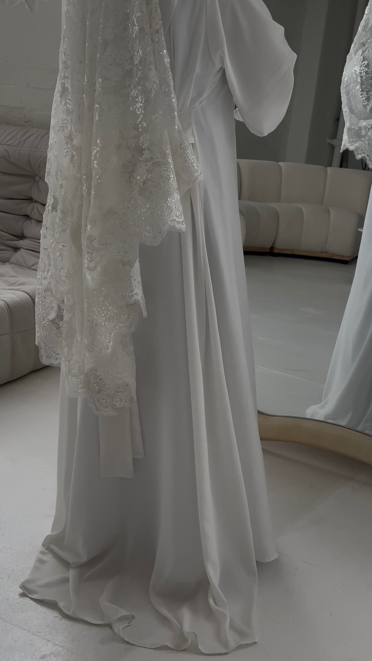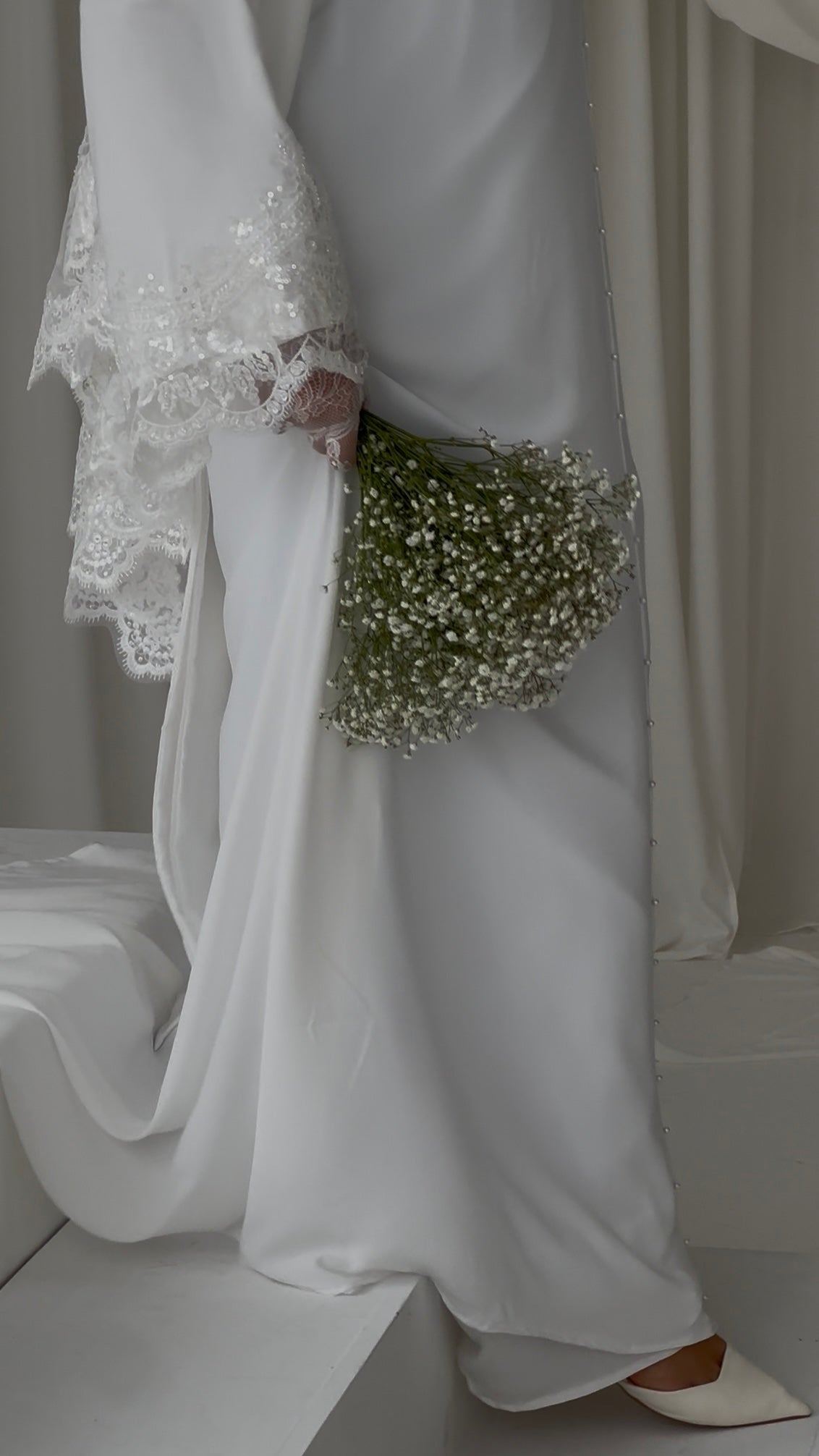 This stunning abaya set is perfect for a special occasion. The abaya has a heavily beaded lace trim on the sleeves . The abaya also features a heavily embellished veil. Abaya is fully lined and includes a hijab and lace veil