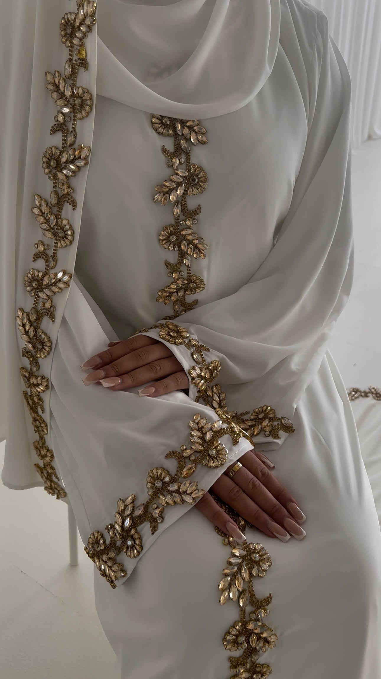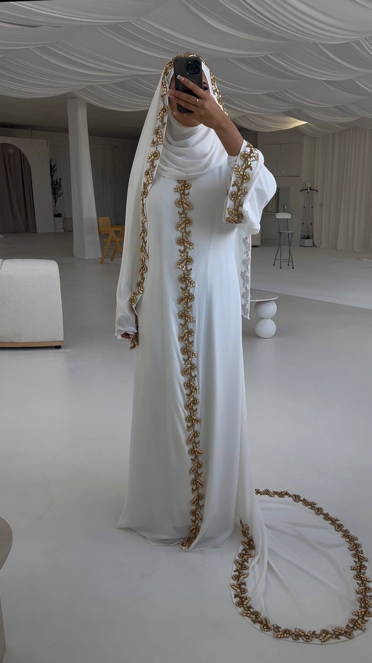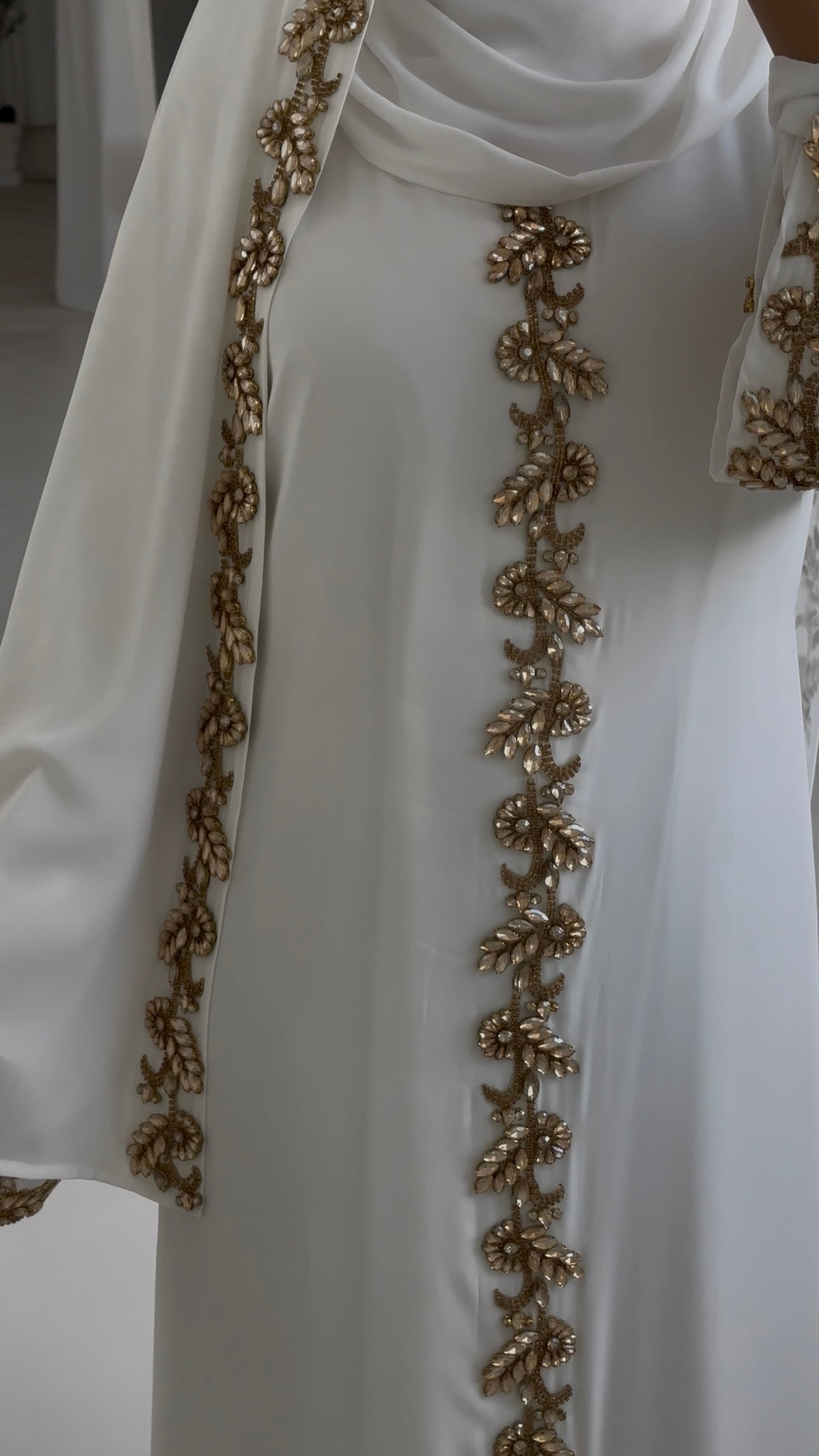 This abaya is perfect for the modern day bride. It features an ivory abaya with gold appliqué on the sleeves and on the front & trail of the abaya. The detail adds a touch of elegance that will make you stand out on your special day.
