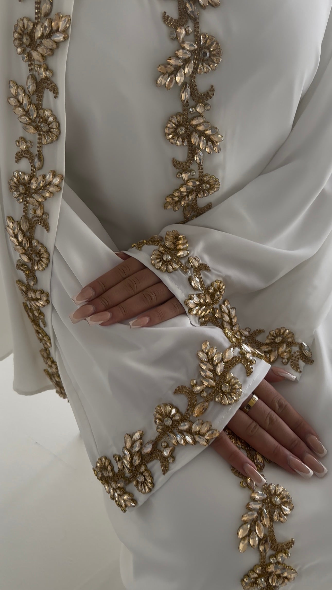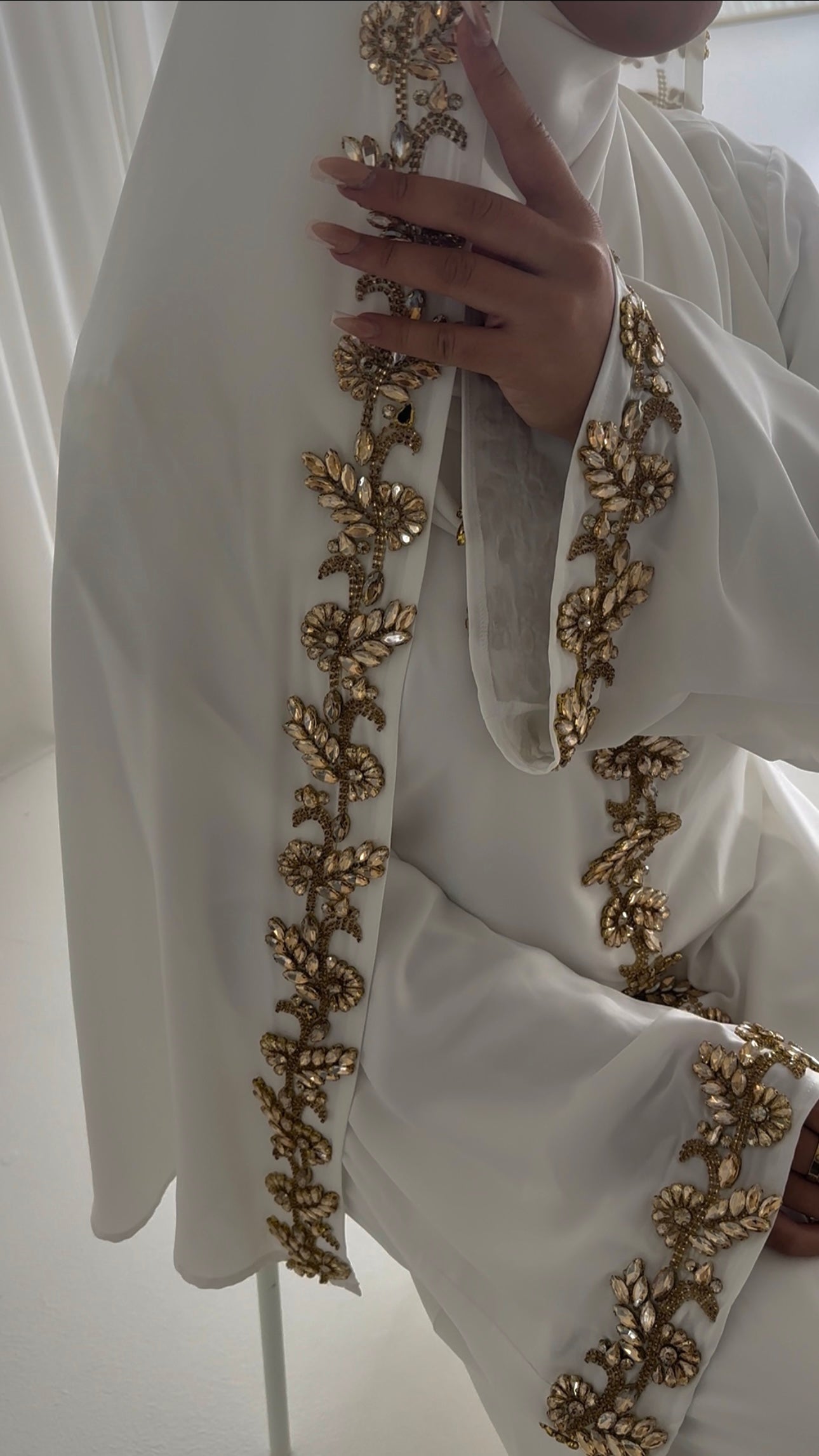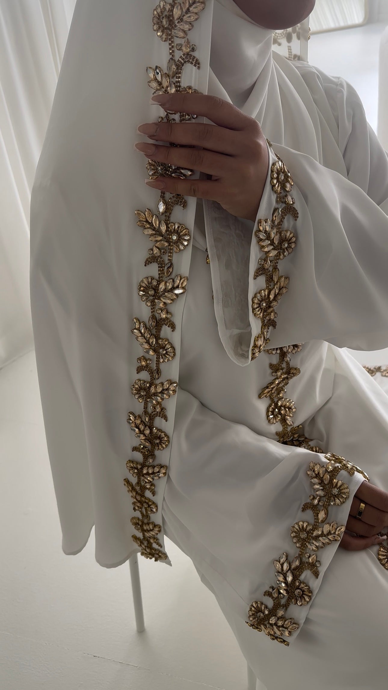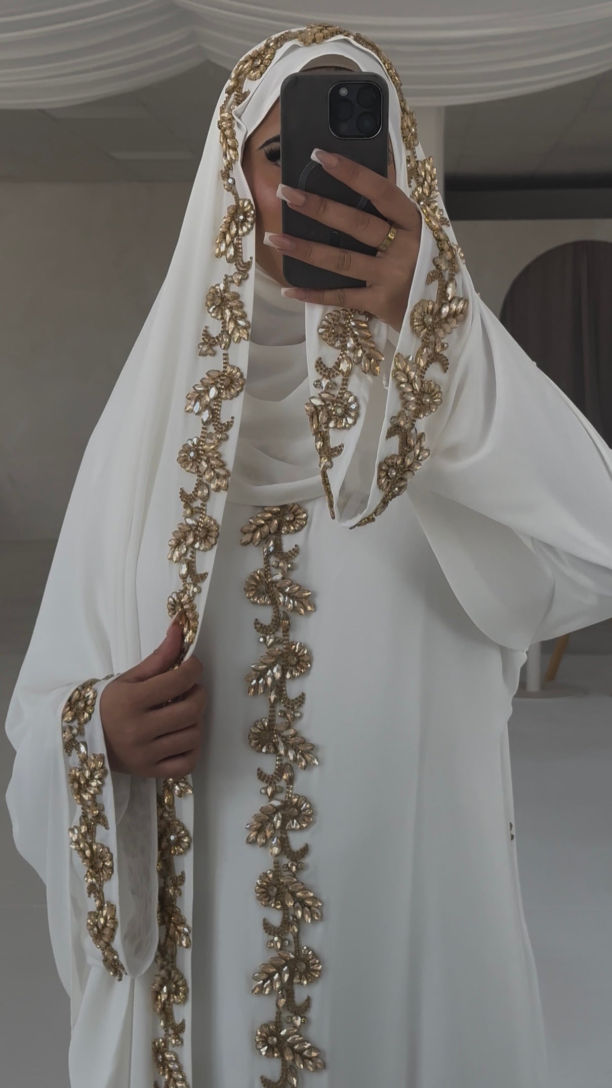 This abaya is perfect for the modern day bride. It features an ivory abaya with gold appliqué on the sleeves and on the front & trail of the abaya. The detail adds a touch of elegance that will make you stand out on your special day.